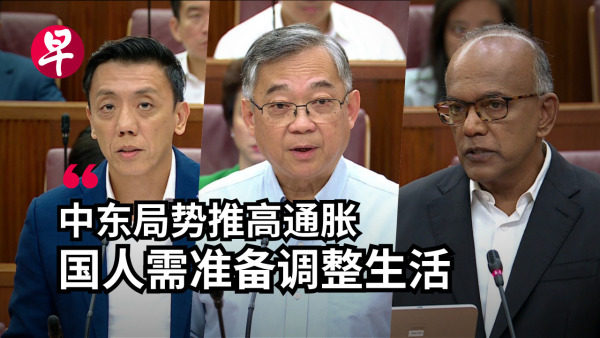 新加坡内政部部长尚穆根(右一)召开新闻发布会,号召居民调整生活应对能源紧缺 联合早报