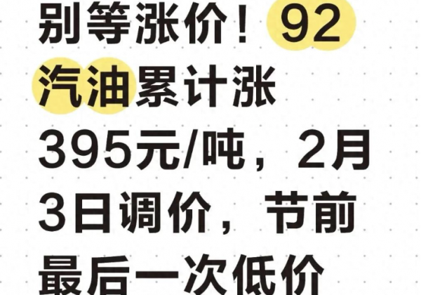 油价涨跌是市场常态,开年这波超395元/吨的涨幅,虽让用油成本有所增加,但本轮调价后春节油价稳定,节后还大概率下调,不用过度纠结。对所有车主来说,当下最关键的就是抓住2月3日24时前的最后低价窗口,错峰加油、用好优惠,把涨价影响降到最低。几毛钱的涨幅看似微不足道,但累积起来也是一笔不小的支出,尤其是营运车主,每一分钱的节省都是实实在在的收入。