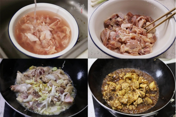 1、半只鸡剁块,冲洗后加水和一勺盐,抓揉浸泡十分钟,泡出血水洗净,捏净水分。