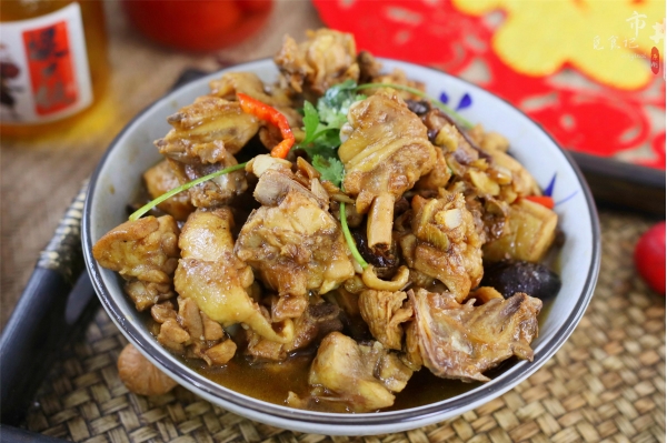 所需食材:鸡肉、干香菇、红椒、大蒜、葱、生姜、香葱
