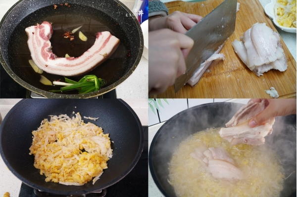 1、五花肉冲洗干净,猪皮那面向下放入铁锅烤至焦黄,再刷洗干净,放冷水锅里加葱姜、胡椒、八角,煮半小时捞出。