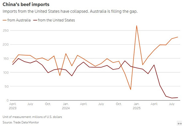 另据路透社9月29日报道,自特朗普重返白宫以来,美国对华牛肉出口显著下降,过去五个月的出口额较往年平均水平减少数亿美元。