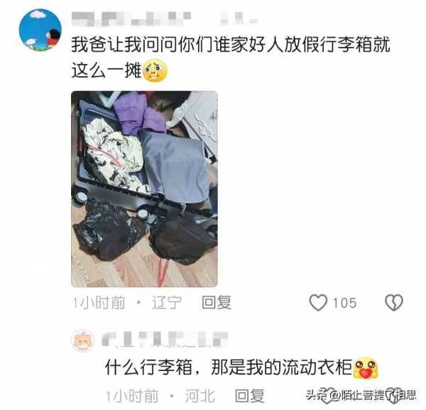 这位妈妈边收拾边吐槽,这些东西又没地方放了。姐姐就问妈妈"那我弟上大学之前,你这堆东西都放在哪儿?"妈妈闻言不假思索道"你房间啊,那时候你刚好在上大学~,现在你大学毕业了,你弟刚好又上大学了,等你弟大学毕业了,你也该出嫁了~,总归,这堆东西都是有地方放的……"说完,妈妈脸上露出了"哈哈,我真机灵"的表情。
