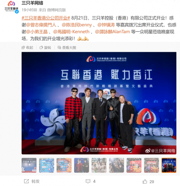 据三只羊网络官方微博消息,8月21日,三只羊控股(香港)有限公司正式开业。