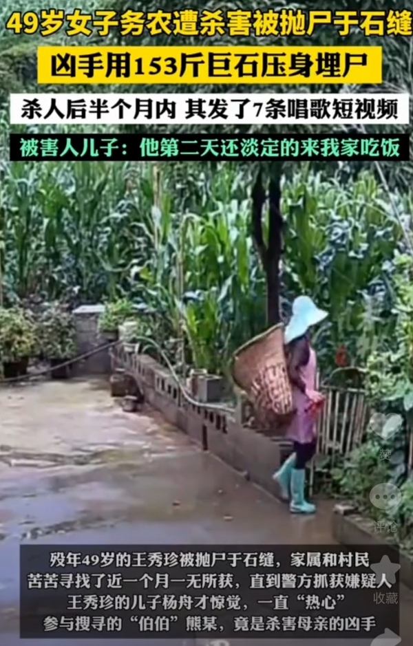 2023年7月3日清晨,49岁的王秀珍像往常一样背着背篼去地里割草。她沿着熟悉的小路走向红薯地,却不知这是她人生最后的行程。在绿意盎然的田间,她遇见了熊某--这个与她家仅相隔两三百米、平日里常走动的"半个亲戚"。