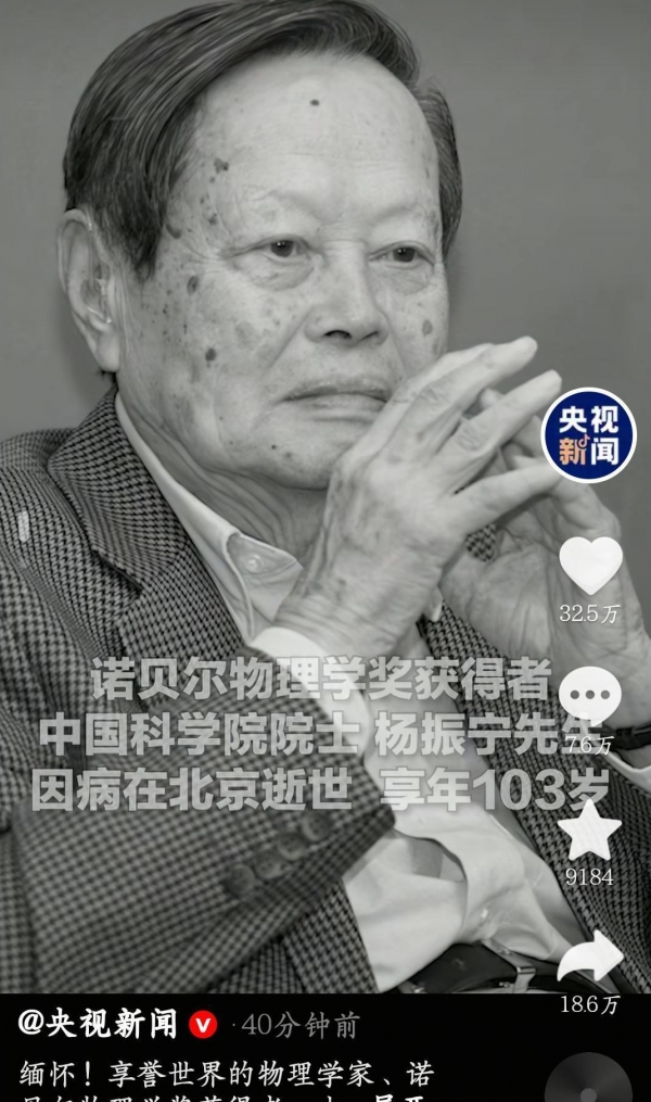 再往后一条是10月18日清晨传来的,杨振宁在北京去世,享年103岁。这个名字在物理学界的分量不用多说。1957年,他和李政道共同拿到诺贝尔物理学奖,那一刻对华人在国际科学界的影响很大。同行和学生谈他时,常说两个方面:一是对科研的投入,二是对家国的感情。1971年起他开始回国探访,后来做了决定性的选择:放弃美国国籍,回到中国学术体系,成为中国科学院院士。晚年住在清华的"归根居",八十多岁时还给学生上课,板书一笔一划看得出来认真劲儿。去世前几个月,他还在改学术稿,办公桌上摆着一摞摞写满公式的手稿--媒体报道里常用这类画面来说明他"工作到最后"的状态。学界和校友们对他的纪念既有对学术贡献的技术性描述,也有很多关于他为人处世的小细节,这些细节比简单的头衔更能让人记住他。