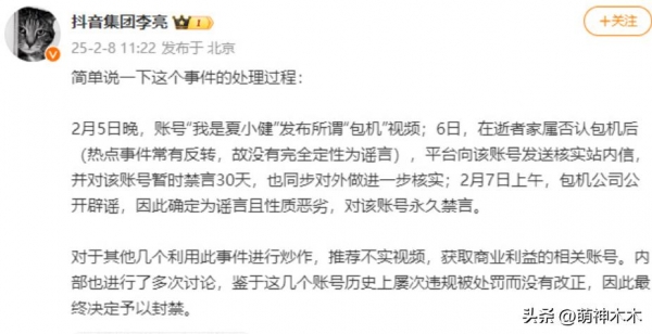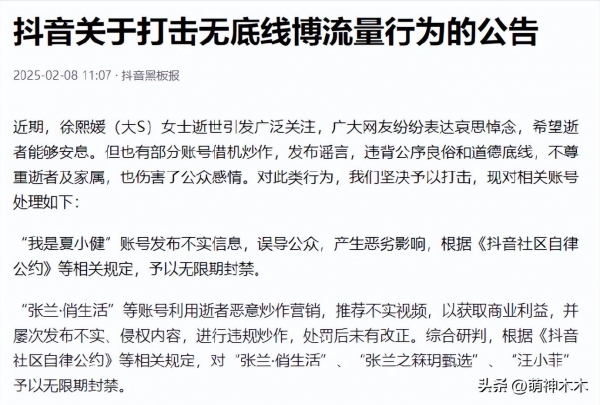 据悉,当时汪小菲账号被封,是因为大S去世后传出的包机事件,李亮以利用逝者恶意炒作营销,永久封禁了张兰和汪小菲等人短视频账号。