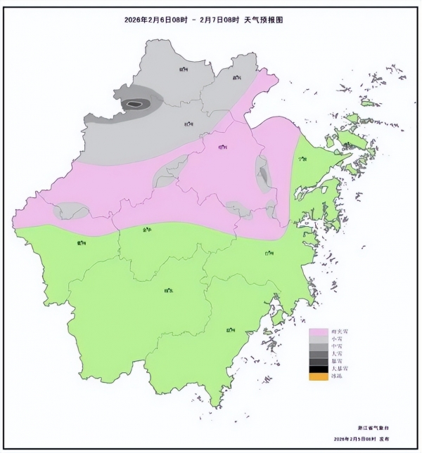 据浙江省气象台预报,受寒潮影响,昨天(2月5日)夜里至明天,全省自北而南有明显降温、雨(雪)和大风天气,大部地区日平均气温过程降温幅度10~12℃。