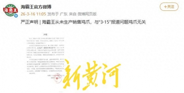 3月16日,@海霸王官方微博发布声明。以下为全文: