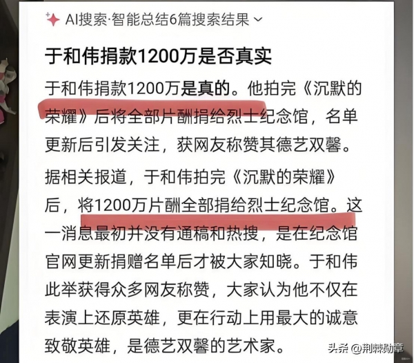 10月底11月初,网上开始传于和伟把《沉默的荣耀》的1200万片酬全捐了。