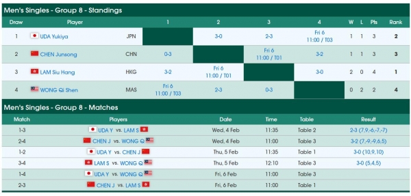 这场比赛之前,林兆恒二连胜小组第一,宇田幸矢1胜1负小组第二,陈俊菘1胜1负小组第三。陈俊菘因为此前是0-3惨败宇田所以他是第三,所以陈俊菘这场VS林兆恒等于是生死战,如果陈俊菘输给林兆恒就被淘汰,如果是3-2赢球就必须宇田输给黄祺燊他才能晋级,只可惜宇田赢球了。