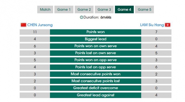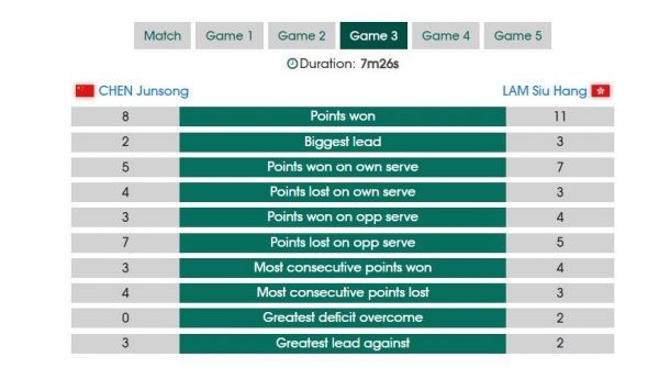 第三局陈俊菘开场2-1领先,随后林兆恒直接打出3-0的攻势反超,其后陈俊菘就再度落入下风一直被迫追分,林兆恒9-7领先,随后10-8局点,陈俊菘8-11再输一局。