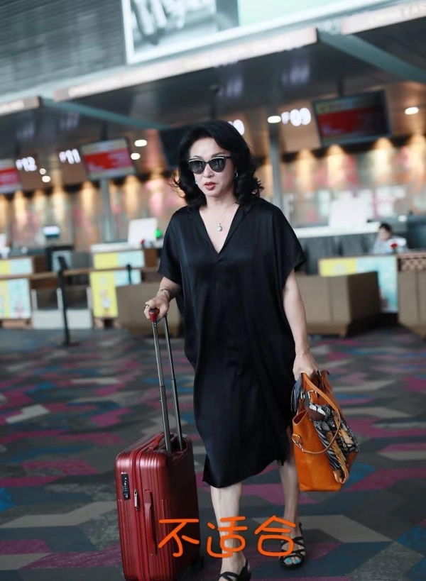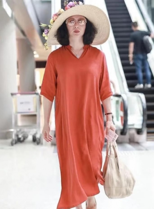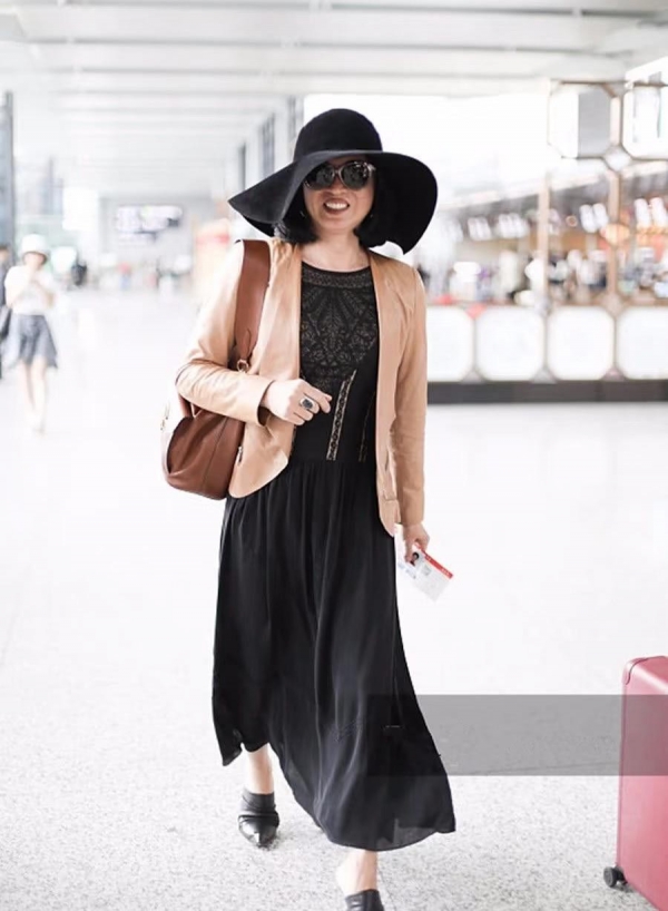 她不总是走贵妇路线。有时候,一身黑色套裙,一副墨镜,简单又舒服。裙子宽松,走起路来没什么压力。