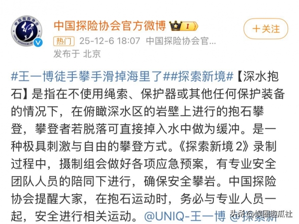 不仅仅是让粉丝安心,更是科普,让大家知道节目的安全性。王一博参加的综艺确实是有危险存在的,徒手攀岩、没有绳索,听着都非常害怕。