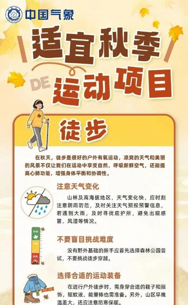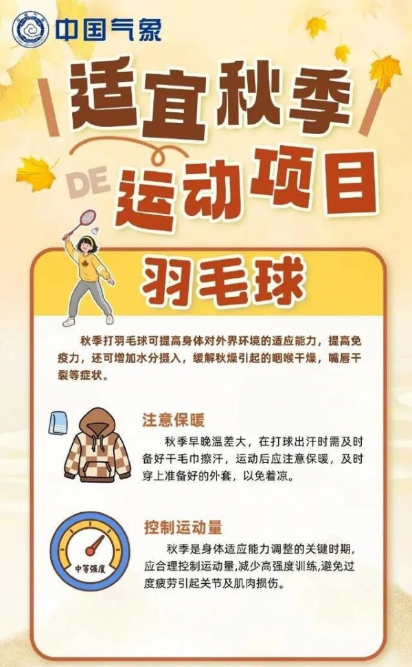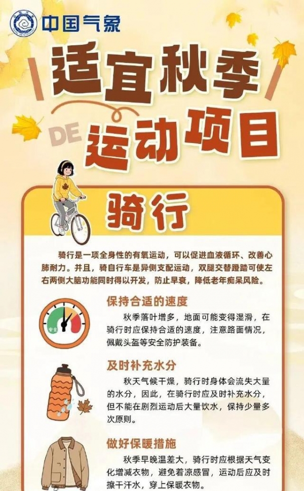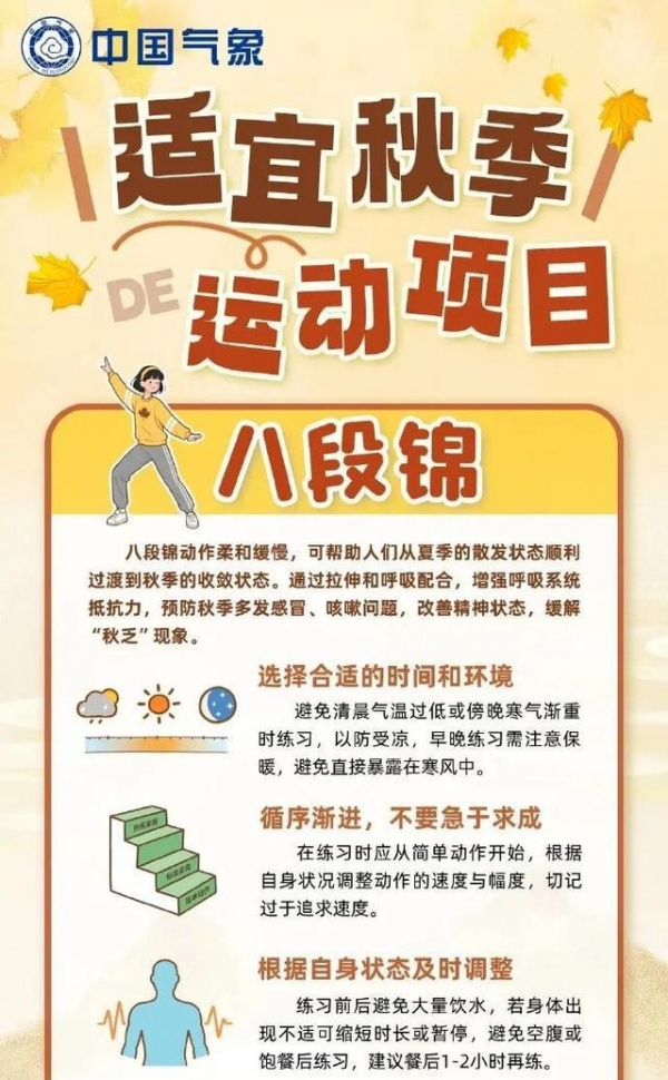 早晚冷晨跑不再汗流浃背,清新的空气让锻炼变得容易坚持。很多中年朋友开始组队徒步或者练太极,还有年轻人晨跑拍照发朋友圈。秋季运动其实效果特别好,"科学研究表明,只要坚持每天步行或轻运动,对身体好处不少"。相比夏天闷热,这种时节反而是修炼身体的黄金窗口。