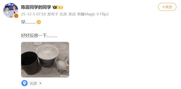 主号被禁言后,陈震本人通过另一个账号"陈震同学的同学"发文回应称:"好好反思一下………"并在视频中表示:"没啥可说的,自作自受,多检讨自己,会好好反思,应该多给大家带来一些乐观的正能量,而不是一些很激烈的言辞,吃一堑长一智,以后会注意。"