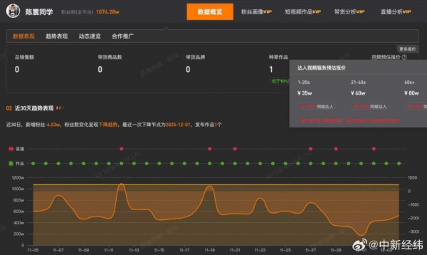 第三方数据显示,"陈震同学"视频平台近30日掉粉4.53万。此外,其1秒-20秒视频广告报价为35万,21秒-60秒视频广告报价为60万,60秒以上视频广告报价为80万。