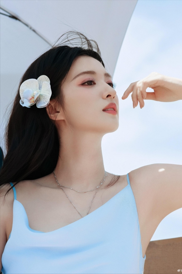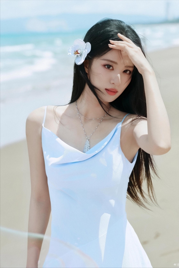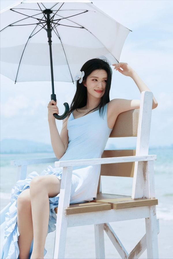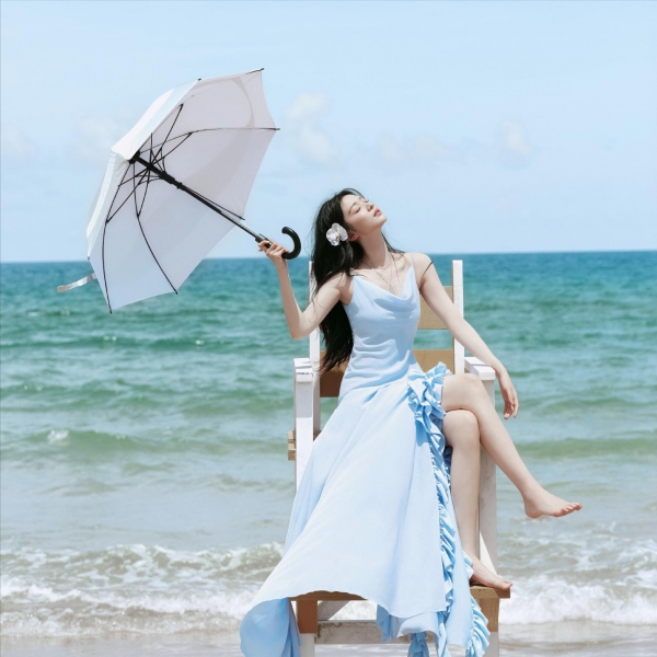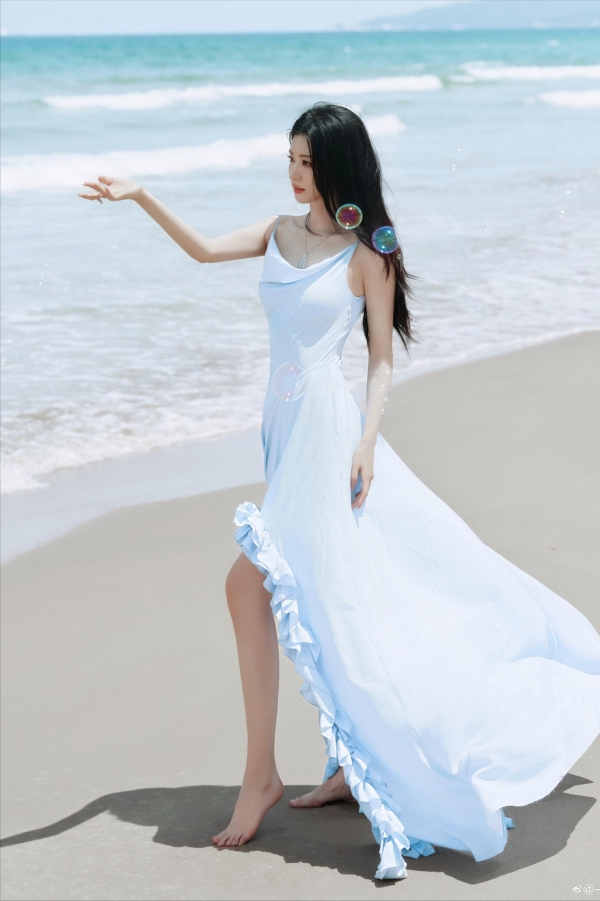 一件简简单单的蓝色长裙,跟身后的大海和天空交融在一起。细细的吊带松松的挂在肩膀上,那直角肩和漂亮的锁骨线条,被几缕碎发似有似无的拂过,欲说还休。