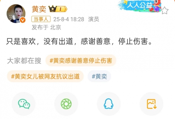 现在网友们都反对,黄奕就发声明说女儿没有出道,只是去韩国体验了一下练习生的日常,希望网友们停止伤害,不要骂她女儿了。