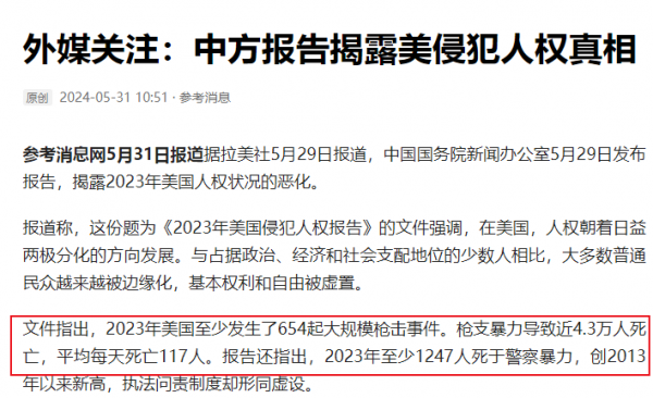 而且美国枪击案频发,5月29日,中国公布了《2023年美国侵犯人权报告》,报告称2023年,发生了654起以上的大规模枪击案,造成4.3万人死亡,平均每天死亡117人。其中有1247人死于警察暴力执法,这就是美国所谓的法治。报告指出美国以不到5%的世界人口,占据全球在押囚犯的25%,由此可见美国的犯罪率有多么高。数据和事实都证明,美国才是全球人权问题最严重的国家。