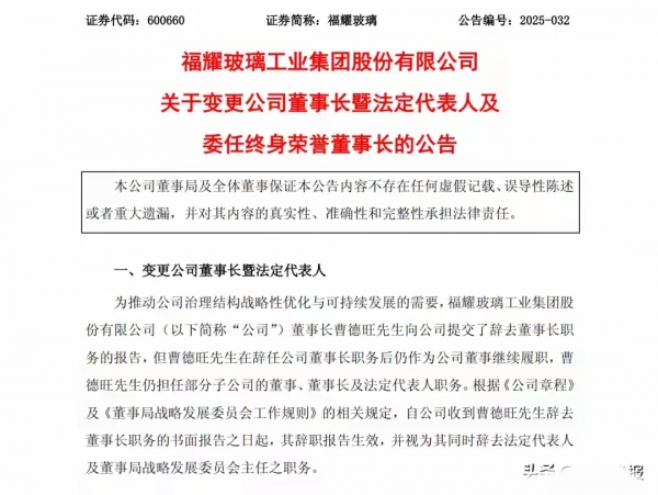 10月16日,福耀玻璃(600660.SH)发布重磅公告:创始人曹德旺正式辞去董事长职务,由长子曹晖接任,同时曹德旺被授予"终身荣誉董事长"称号 。这标志着这家市值超1700亿的全球玻璃巨头,正式进入"曹晖时代"。
