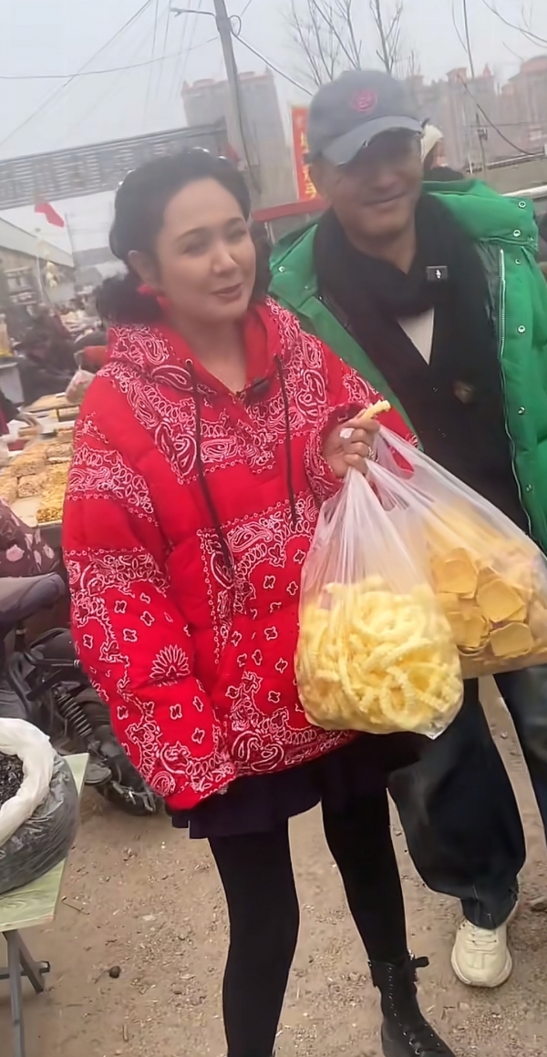 被偶遇时,程莉莎手上提着两大袋的干果炒货零食,郭晓东手里也提着不少东西,真是把老婆当女儿一样宠。程莉莎从小生活在城市,逛农村大集是看什么都新奇,看什么都想吃。