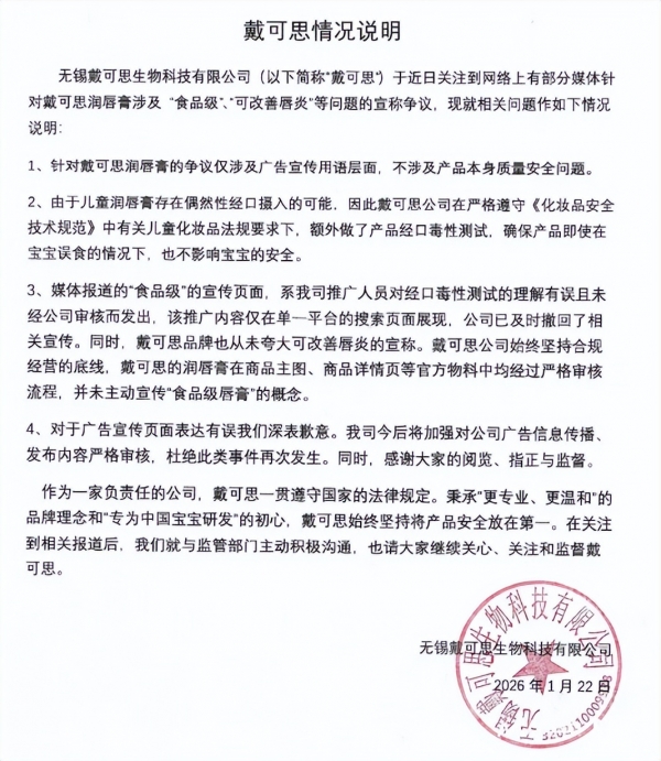 媒体报道的"食品级"的宣传页面,系公司推广人员对"经口毒性测试"的理解有误且未经公司审核而发出,该推广内容仅在单一平台的搜索页面展现,公司已及时撤回了相关宣传。针对戴可思润唇膏的争议仅涉及广告宣传用语层面,不涉及产品本身质量安全问题。