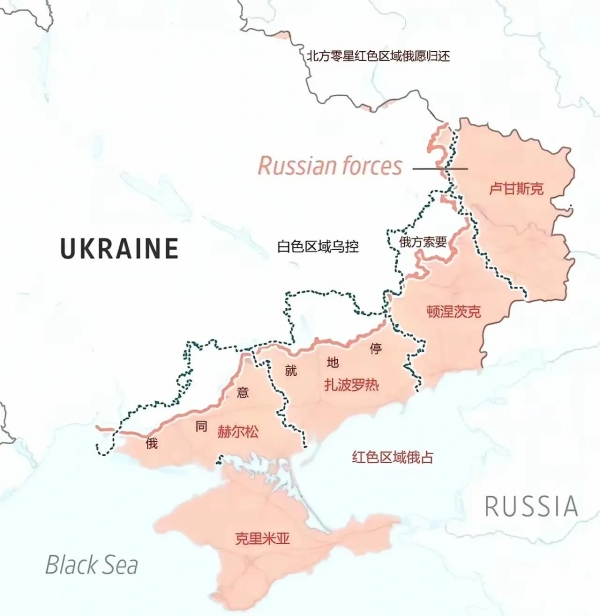 第一、乌克兰军队必须从顿涅茨克州全部区域撤出。如果乌方能做到这一点,俄方将"冻结现有的战线"。因为卢甘斯克州已被全部占领,这意味着俄方将不再谋求占领赫尔松州和扎波罗热州的剩余部分。