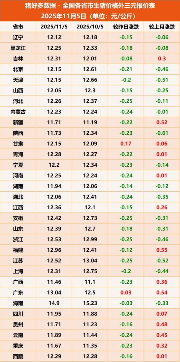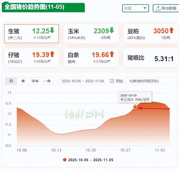 从猪价重心来看 ,周内猪价涨幅已全部化为"泡影"!根据猪好多数据的监测,11月5日全国外三元生猪均价为12.25元/公斤,较昨日下跌0.22元/公斤,与上周三(10月29日)相比,下跌0.08元/公斤。总之,自进入11月份,猪价涨幅不断"回吐",考验养殖户心态。