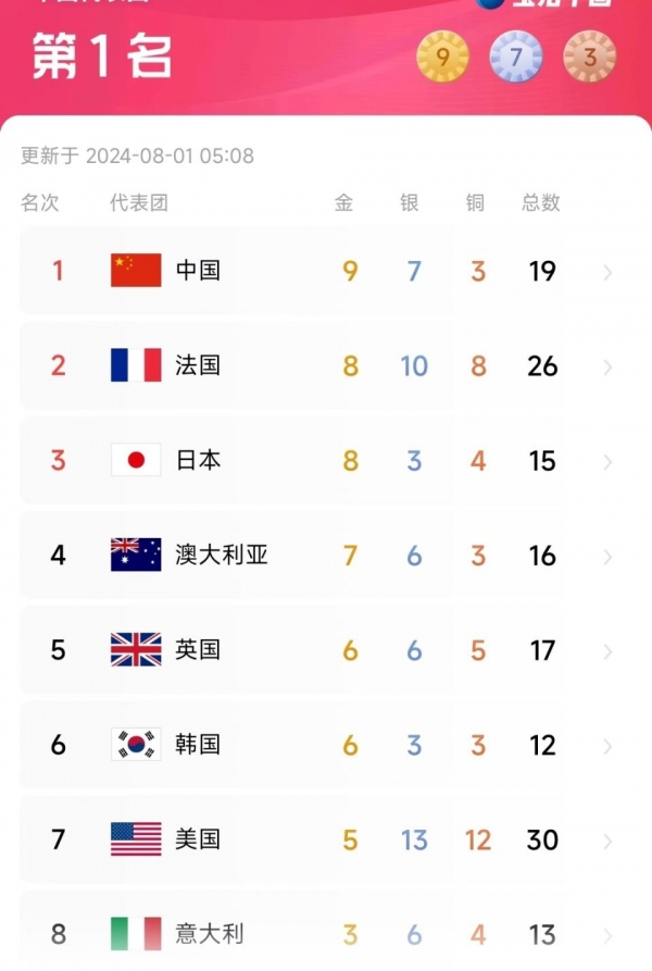 北京时间8月1日消息,2024年巴黎奥运会结束第五个比赛日的争夺。刚刚结束的男子100米自由泳决赛中,中国选手潘展乐发挥出色,以46秒40秒的成绩夺得金牌并打破世界纪录。金牌榜上,中国奥运代表团的金牌总数达到9枚,力压法国、日本的8金。