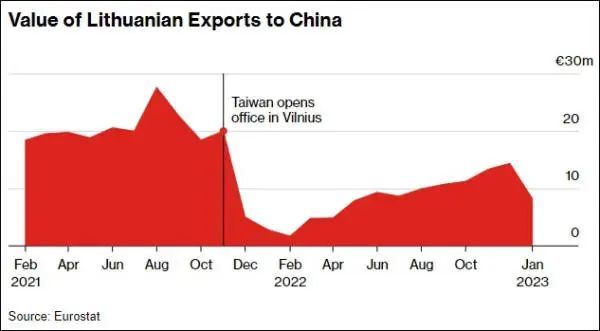 立陶宛对华出口额,数据来自欧盟统计局。 图源:彭博社