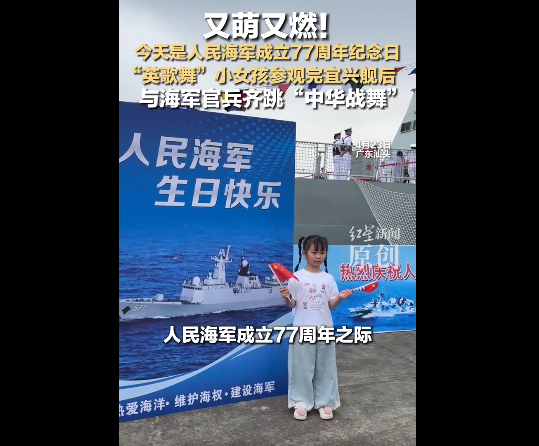 又萌又燃!今天是人民海军成立77周年纪念日,"英歌舞"小女孩参观完宜兴舰后与海军官兵齐跳"中华战舞"。