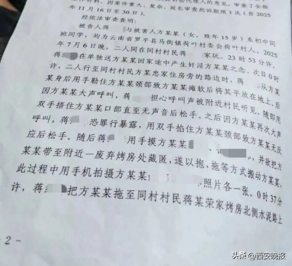 此前,被害人父亲方先生提供的曲靖市人民检察院起诉书显示:经审理查明,2025年7月6日晚,方某涵与蒋某某同在同村村民家玩,23时53分,蒋某某在单独送方某涵回家途中产生奸淫之念。次日0时许,二人同行路上,蒋某某从方某涵身后用手勒住其颈部,致方某涵瘫软后将其平放在地上。因方某涵大声呼叫,蒋某某担心被附近村民听见,用双手掐住方某涵颈部致其无反应后松手。随后蒋某某用手摸方某涵身体私密处,并欲把其带至附近一废弃烤房处藏匿,遂以抱、拖等方式搬动方某涵,在此过程中,蒋某某用手机拍摄方某涵私密处照片,0时37分许,蒋某某把方某涵拖至同村村民蒋某荣家烤房北侧水泥路时,因接到其母亲电话催促回家,遂把方某涵放在路边后逃离现场。