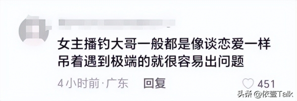 还有网友表示,"女主播钓大哥,一般都是像谈恋爱一样,吊着遇到极端的就很容易出问题!"