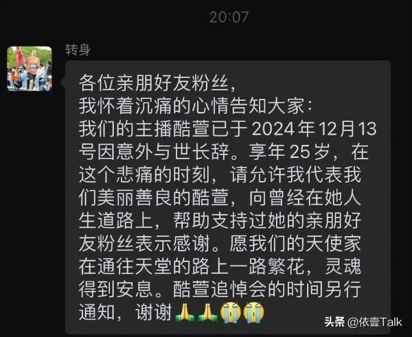 关于最先传出酷萱去世的消息,还是她的朋友在13号在粉丝群发出的消息。