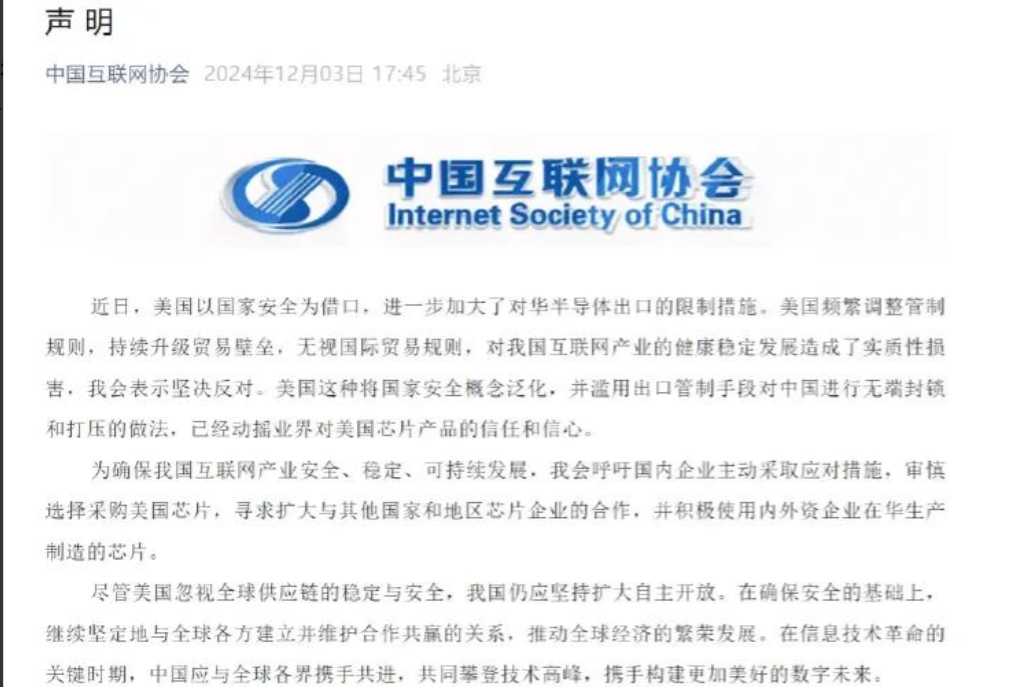 近日,美国以国家安全为借口,进一步加大了对华半导体出口的限制措施。美国频繁调整管制规则,持续升级贸易壁垒,无视国际贸易规则,对我国互联网产业的健康稳定发展造成了实质性损害,我会表示坚决反对。美国这种将国家安全概念泛化,并滥用出口管制手段对中国进行无端封锁和打压的做法,已经动摇业界对美国芯片产品的信任和信心。