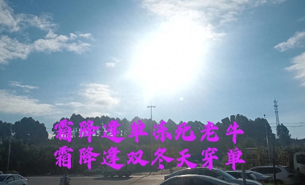 时间过得好快,今天也是寒露节气的第五天,离霜降节气又近了一天,这个时期本应该是感觉凉冷,换短袖穿长袖长裤的时候,可大部分南方秋老虎还强烈,虽早晚温差大,但一到中午太阳直射,气温依然还处在30℃左右,搞得一天要两次增减衣服。这天气是否有点反常,都快霜降节气了还这么热,今年冬天又是什么情况呢?为此老辈人还留下来一句谚语:霜降逢单冻死老牛,霜降逢双冬天穿单。那今年是啥情况?霜降交节的单双与冬天冷暖有啥关系呢?要知其中原由不妨接着往下看。