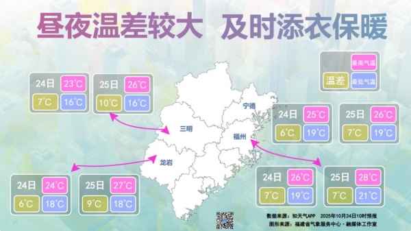以省会福州为例,白天在阳光的照耀下,最高气温回升到26℃上下,温暖舒适。但夜晨时段地面热量散失很快,最低气温在20℃左右。目前已是霜降节气,冷空气频繁,气温起伏加剧,进入昼夜温差最大时段,朋友们需注意气温变化,及时添加衣物,以免着凉感冒。