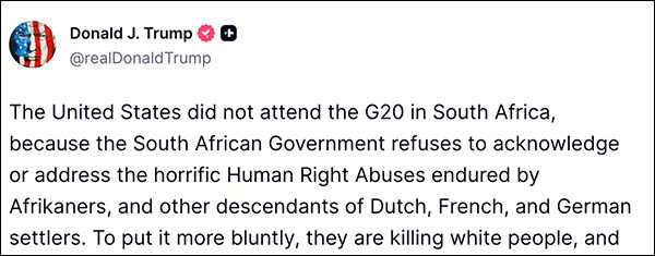 当地时间11月26日,特朗普在社媒车轱辘话重复了一通虚假说法后称,鉴于南非在今年G20峰会期间拒绝将主席国身份交接给一名美国政府代表,他将禁止南非参加明年的峰会,并立即停止对该国的一切援助和补贴。