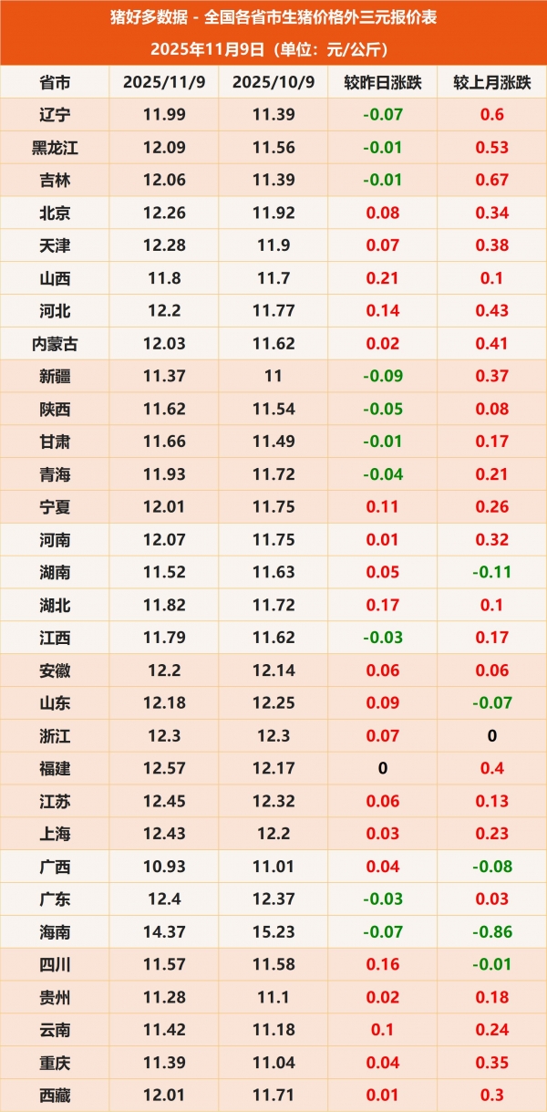 猪好多数据监测显示,11月9日全国外三元生猪均价为11.99元/公斤,较昨日上涨0.04元/公斤。这也意味着11月份以来的"8连跌"终结,猪价行情再次转入上行通道,不过养殖户更加关心的是,猪价能否形成连涨?