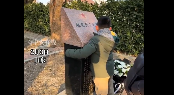 2月3日,山东。两孩子给去世6年的烈士爸爸扫墓,孩子们抱着爸爸的墓碑哭的撕心裂肺,孩子母亲:第一次来 以前不敢带他们来。