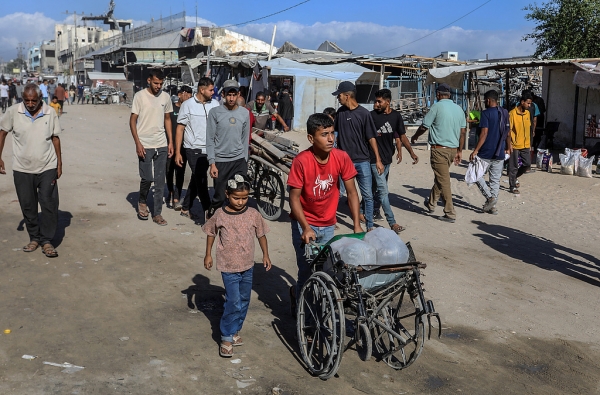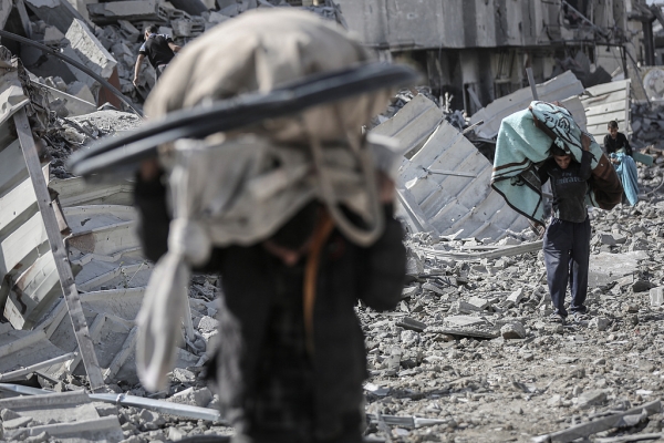 当地时间2025年10月10日,加沙地带,随着加沙地带停火协议生效,巴勒斯坦民众携带随身物品从加沙南部返回北部地区。