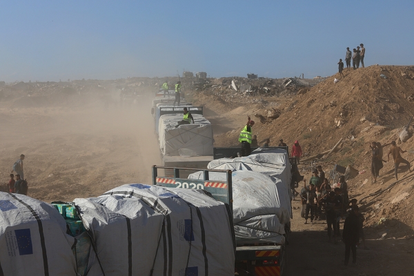当地时间2025年10月10日,加沙城,停火协议生效后,巴勒斯坦商人的卡车满载食品和水果,经内扎里姆走廊以南的萨拉丁街进入加沙地带。