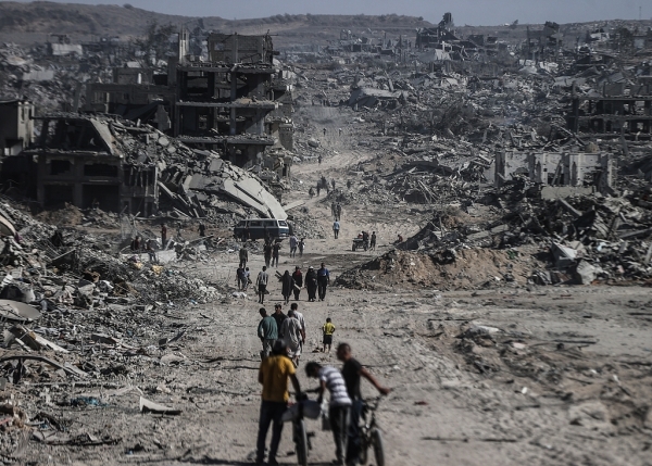 当地时间2025年10月10日,加沙地带加沙城,停火后,巴勒斯坦民众走过废墟。