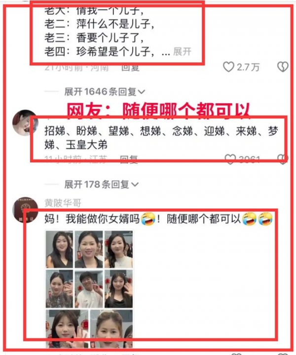 网友一开始没看到最小的儿子的时候 ,都纷纷认丈母娘,都觉得女儿多是好事,到时候是一大堆亲戚,可是当看到这么多女儿,都是为了生个儿子,网友们觉得女方家里可能有点重男轻女,所以都不愿意继续了