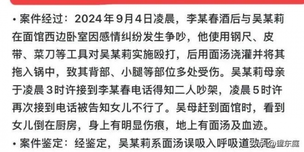 据丈夫的口中表述,起初两人在卧室中发生争吵,小吴被丈夫用做面工具殴打,从卧室到厨房,短短的几个小时里小吴遭受到可怕的家暴。最后丈夫将其拖到面汤中浇灌,这也是导致小吴死亡的最后原因。