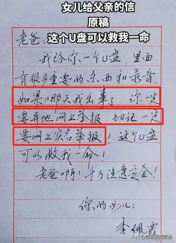 这封信里,李佩霞慎重的交代了自己以后哪天出事了,这个U盘里面有很多重要的东西和录音,她告诉自己的父亲一定要在异地网上举报, 说到底她不知道官场上还有谁可以相信,她只能拜托自己的老父亲,最后一句:老爸啊,千万注意安全!更是对自己父亲举报这事充满了担忧,也让我们能直观的感受到毛奇能量的强大。