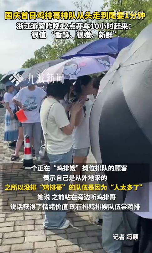 故事始于9月30日中午12点,这位游客带着妻儿从杭州出发,原计划五六小时的车程,在国庆高速的拥堵中被拉伸至整整十小时。深夜抵达,疲惫刻在脸上,但当香酥的鸡排入口那一刻,他所有的辛劳化为一句"很值"的赞叹。次日,当一家人赶到"鸡排哥"摊位前,现实的火热超乎想象:队伍从首至尾需步行一分钟,普通顾客苦候两小时方能一饱口福,就连"鸡排嫂"经营的分摊前,也蜿蜒着至少一小时的等待人龙。最终,他如愿以偿,不仅味蕾得到满足,更在打卡成功后送上真挚祝福:"祝愿鸡排哥越来越好。"