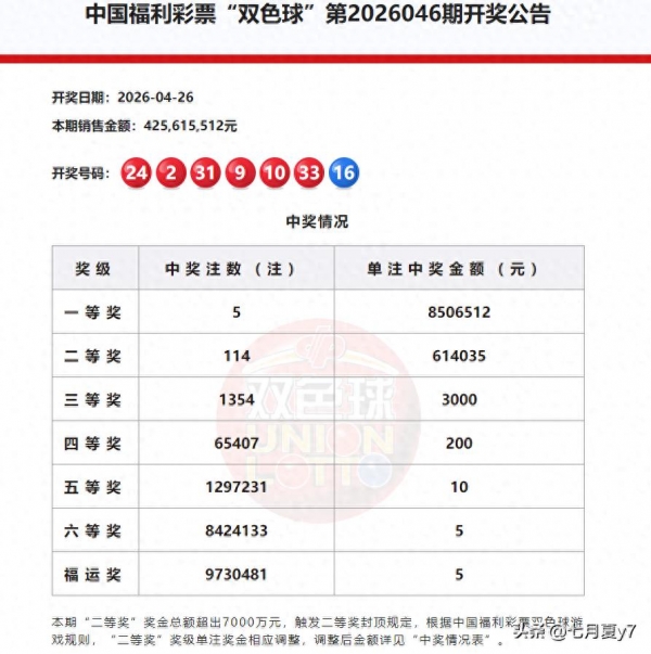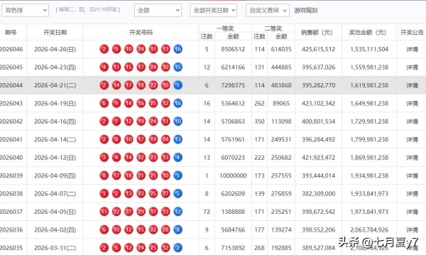 4月26日晚,中国福利彩票双色球第2026046期如期开奖。当期全国销量达425,615,512元,下期一等奖奖池累计金额1,535,111,504元,高位运行态势依旧。