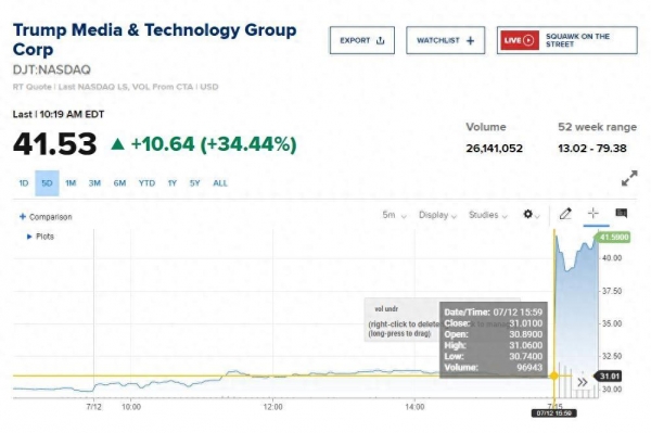 受特朗普遇袭事件后大选胜率上升影响,特朗普概念股大涨。其中,特朗普媒体科技集团(社交媒体平台Truth Social的母公司)一度涨超40%,区块链Phunware也一度涨近30%。后者曾在2020年为特朗普连任竞选活动开发了一款移动应用程序,并一直与特朗普保持着联系。